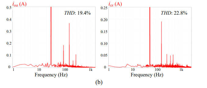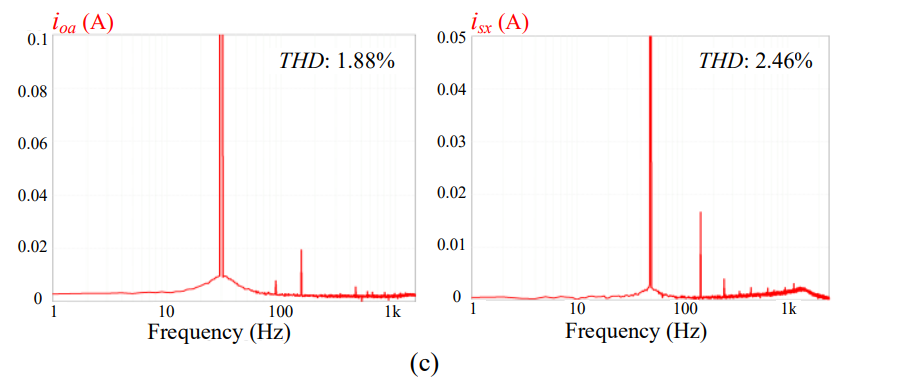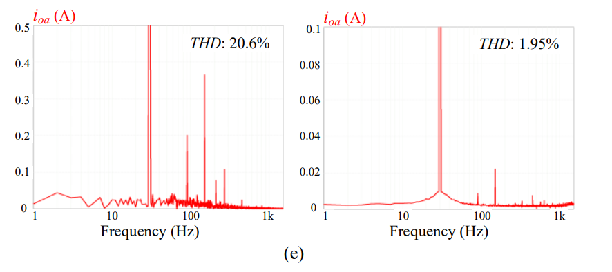(e) DC/AC变换启动识别方法前(左)与后(右)的输出电流总谐波失真(THD)。