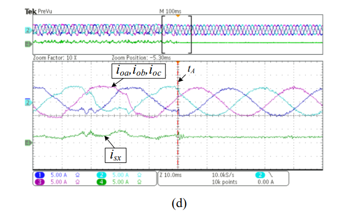 (d) DC/AC变换验证(iₒₐ、iₒ_b、iₒ_c、iₛₓ:5A/div,时基:10ms/div),